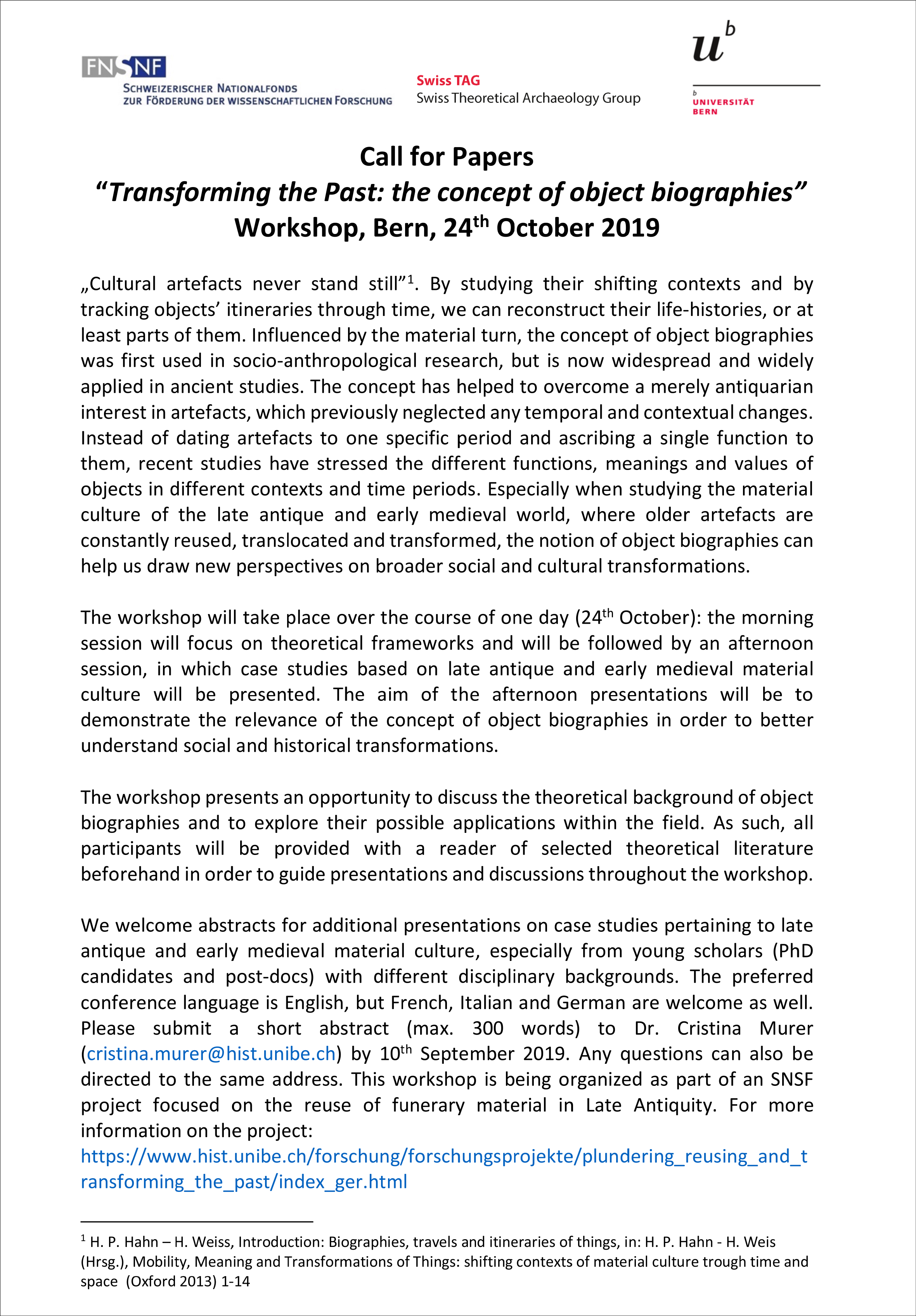 • Workshop Transforming the Past: the concept of object biographies Bern, 24th October 2019